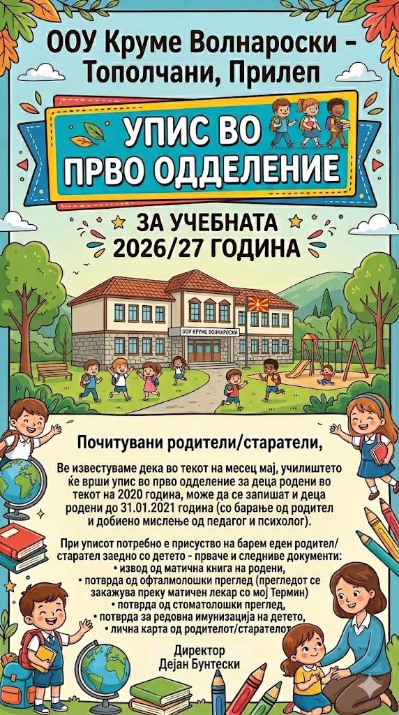 Упис на првачиња 2026-2027 Date 3, април 2026 Tags Првачиња Tag:Првачиња Share: ООУКВ Previous post Упис на првачиња 2024-2025 3, април 2026 You may also like Упис на првачиња 2024-2025 30, април 2024 Почеток на новата учебна година 30, август 2023 Уписи на првачиња за учебната 2023/2024 година 4, мај 2023
